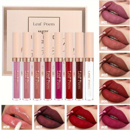 8pcs Matte Liquid Lipstick Set- Waterproof, Non-Stick, Long-Lasting Lip Gloss in Brown, Pink, Purple& Red Shades with Plant Squalane