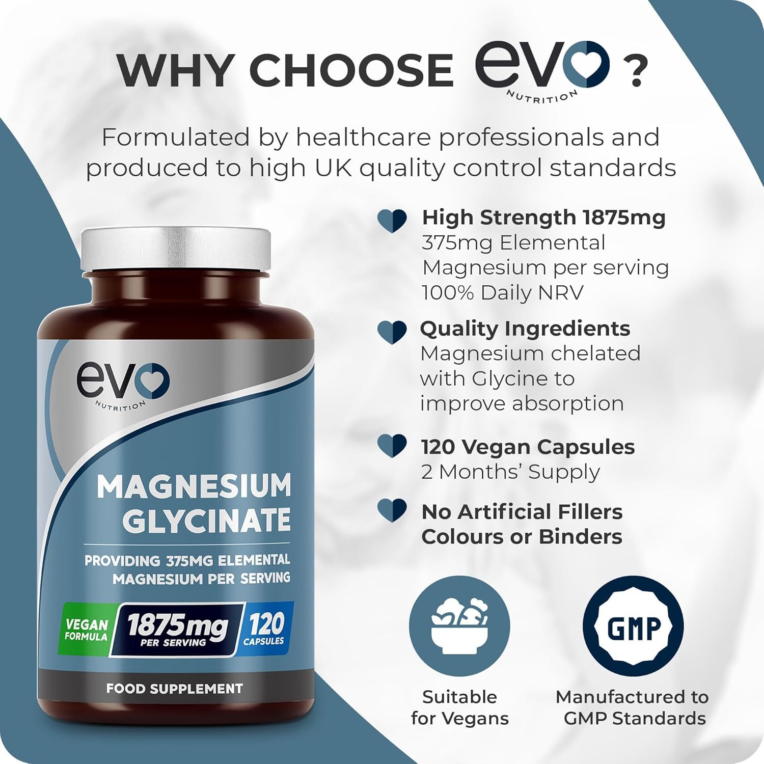 Magnesium Glycinate Supplement – 1875mg Per Serving | 120 Vegan Capsules | 375mg Elemental Magnesium | 100% Daily NRV | High Strength and Maximum Bioavailability | Made in UK by EVO Nutrition